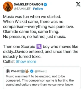 Samklef made the comments while responding to a post by singer-producer Pheelz, who had voiced concerns about the growing culture of constant artist comparisons. According to Pheelz, music is meant to be appreciated for its creativity, not turned into a scoreboard that pits artists against one another.